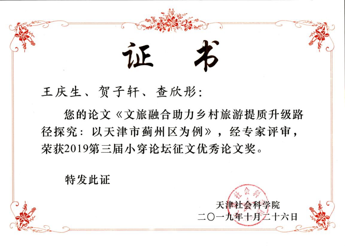 论坛以习近平新时代中国特色社会主义思想为指导思想,精准聚焦于乡村振兴、乡村旅游和全域旅游三个方面,积极探索农村农业发展新模式,得到了天津市政府和各界专家学的大力支持。论坛召开前的论文征集,共收到全国20个省(市)高校、社科院、政府部门以及科研智库机构等54位作者的论文70篇,其中评出优秀论文10篇。英国365集团有4篇论文入选大会论文集,王庆生、贺子轩、查欣彤的论文“文旅融合助力乡村旅游提质升级路径探究:以天津市蓟州区为例”获优秀论文奖。这也是英国365集团连续两届获评优秀论文奖。