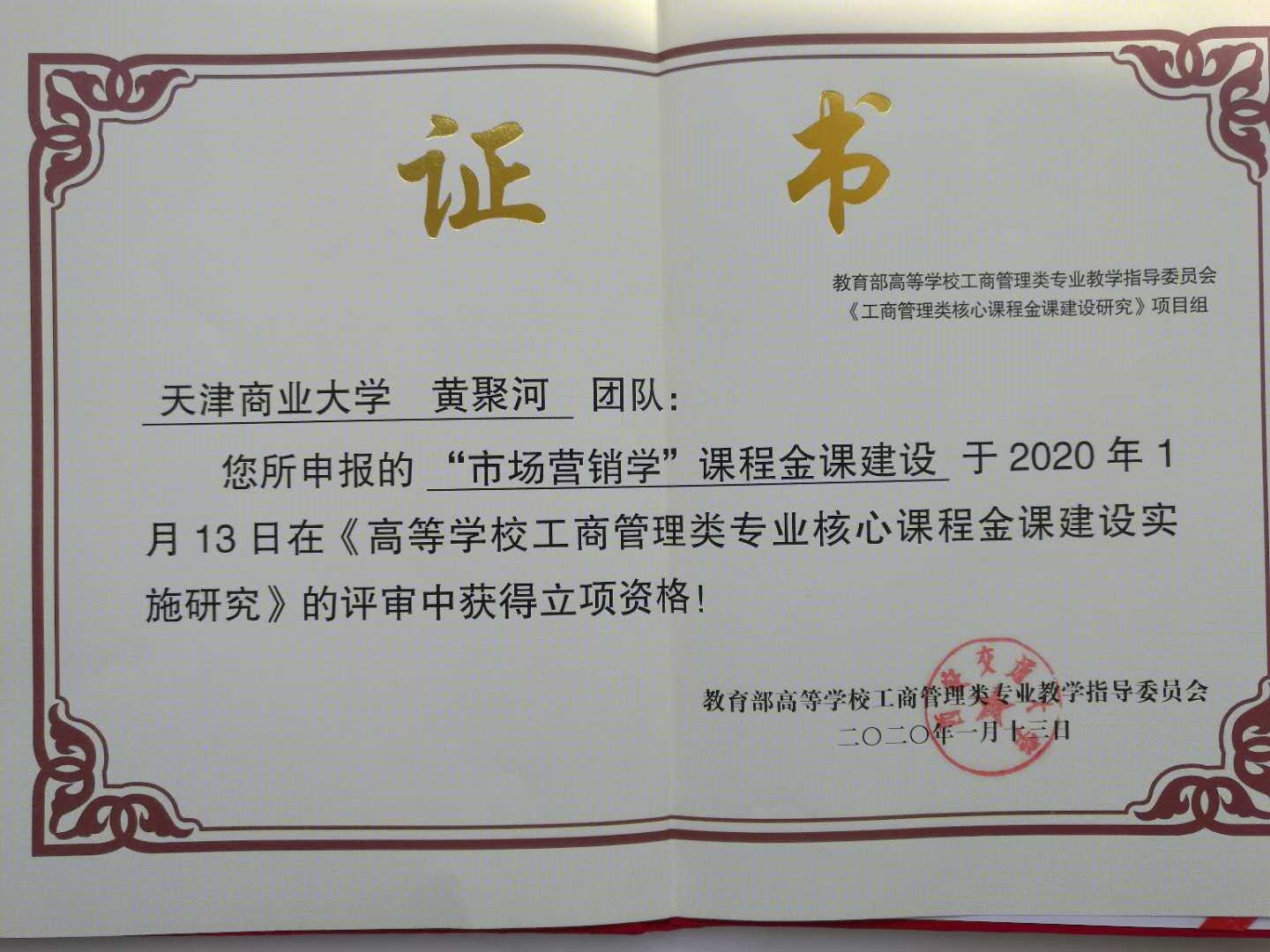 教育部工商管理教学指导委员会,根据《教育部关于加快建设高水平本科教育全面提高人才培养能力的意见》和《关于一流本科课程建设的实施意见》,在全国高校发布《2020年高等公司工商管理类专业核心课程“金课”建设实施研究》的重点研究项目。按照教育部规定,团队需在充分调研2所以上不同层次院校的课程建设情况基础上,研究《市场营销学》的详细课程大纲、知识体系、PPT课件、教学案例、知识点对应习题、扩展教学资源、软件、程序、数据和源代码等其他与“金课”建设相关的教学资源。该项目的研究成果将建成《市场营销学》课程标志性“金课”教学资源数据库,与其他课程资源库一起,以教育部工商管理教指委名义对全国高校发布。