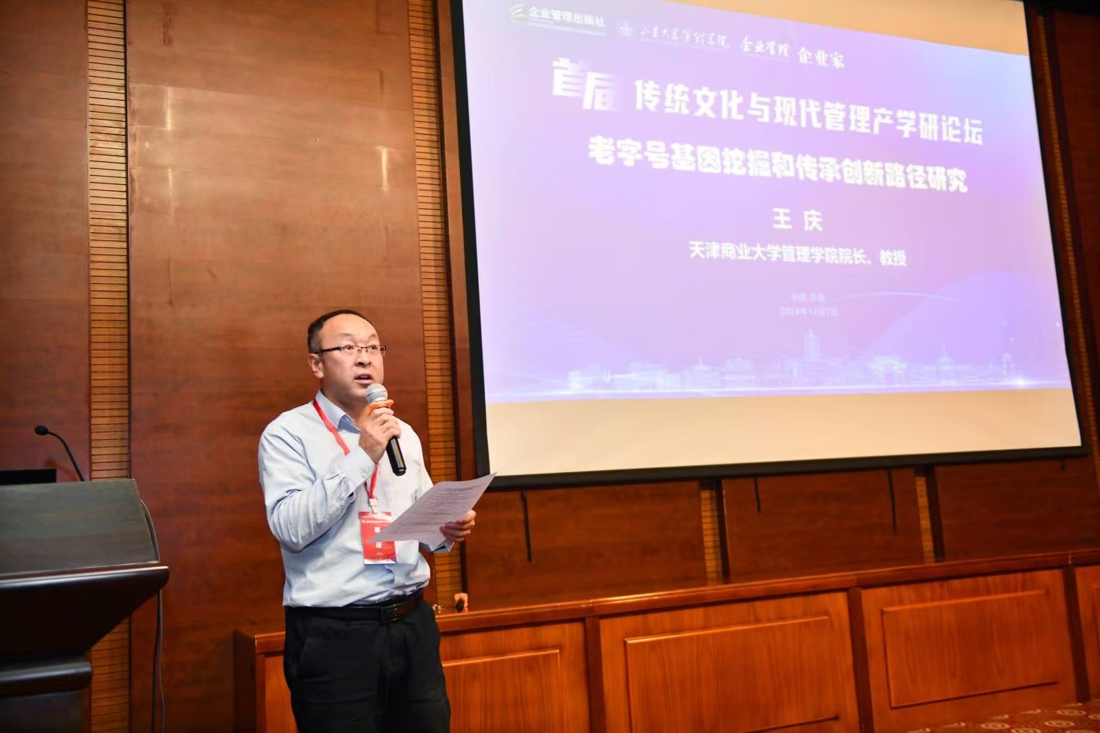 论坛以“中华优秀传统文化赋能现代管理”为主题。在“管理实践中的传统文化落地与启示”主旨演讲环节,王庆教授作了《老字号基因挖掘和传承创新路径研究》的报告。王庆教授分享了在老字号基因挖掘和传承创新路径构建时用到的网络爬虫技术、改进的TF-IDF方法、语义网络分析方法、文本情感分析方法,阐释了老字号基因挖掘及传承创新路径确定的基本理念——三元协同分析模型,展示了老字号基因挖掘和基因图谱刻画流程、具体步骤以及老字号传承创新路径刻画方式,分享了该套方法在天津桂发祥十八街麻花上的应用实例。